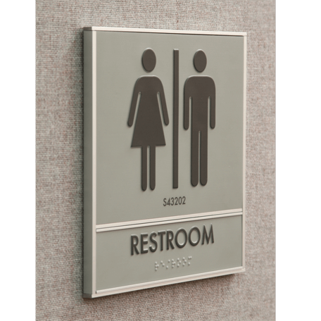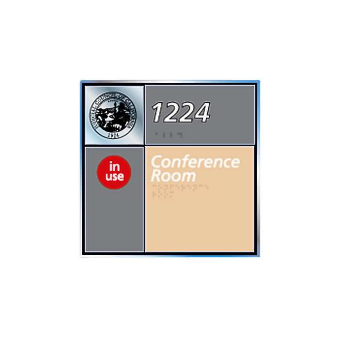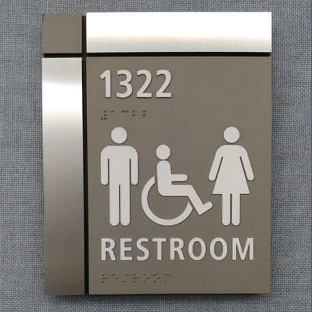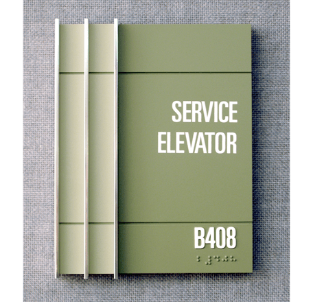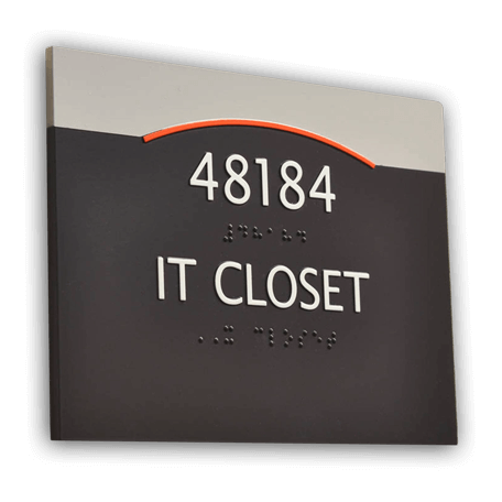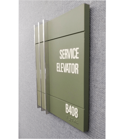 The raised letters and braille are inlaid into laser cut openings on a matte finish background with .030” exposed above background (per ADA Standard). Components are inlaid into any color background, bonded to the substrate and cannot be easily removed or vandalized.