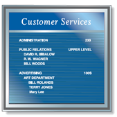 Directories take many forms to communicate information to the user on how to find their destination and other pertinent data. The form of the directory can also establish confidence in the user based on how skillfully it was designed and fabricated, and how it meets the need of disseminating information. The contemporary graphics program contains many elements such as static data that does not change, LED full color animation for changing data, housing and support for end-user touch-screen displays, and many types of fabrication materials, to ensure a visually pleasing and durable product.