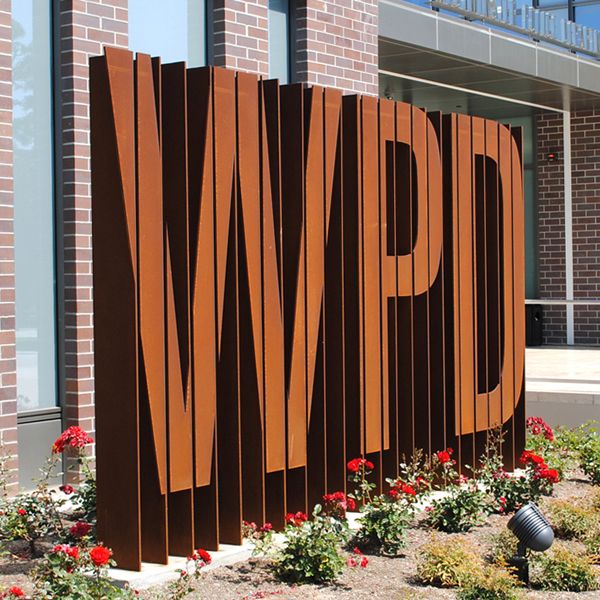 The Westminister Police Department is located within the civic center complex buildings in Westminster, California. The Cor-Ten steel monumental unit shown above and all other indentification and directional signs for this project were engineered, fabricated and installed by Vomar Products.